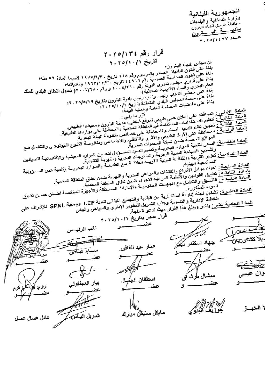 The Lebanese Environment Forum (LEF) announces the successful efforts leading to the declaration of the Batroun Coast Marine Protected Area, issued by the Batroun Municipal Council under Decision No. 134/2025.